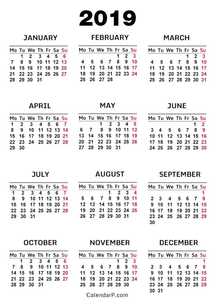 2019 Calendars• Calendars• Calendars 790x1120px• Calendars 790x1120px, Monday Start Printable Free 2019 Calendar with USA Holidays, Red – Monday Start 02/28/201902/28/2019