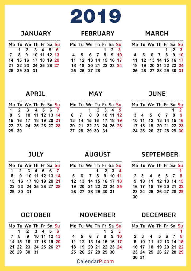 2019 Calendars• Calendars• Calendars 790x1120px• Calendars 790x1120px, Monday Start Printable Free 2019 Calendar, Yellow – Monday Start 02/28/201902/28/2019