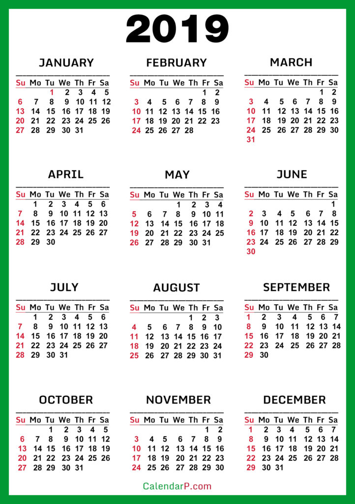 2019 Calendars• Calendars• High Resolution Calendars• High Resolution Calendars Sunday Start Printable Free 2019 Calendar, HD, Green, Red – Sunday Start 03/01/2019