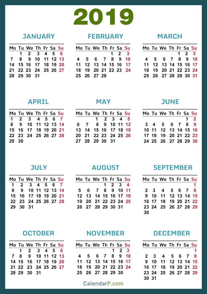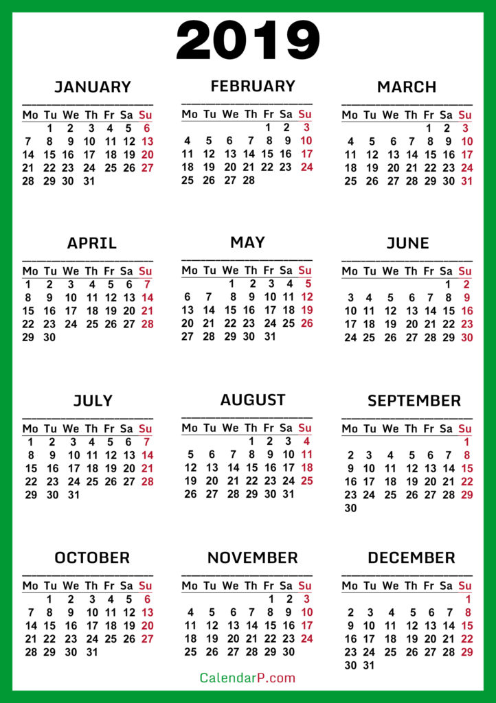 2019 Calendars• Calendars• High Resolution Calendars• High Resolution Calendars Monday Start Printable Free 2019 Calendar, HD, Green – Monday Start 02/28/201903/01/2019