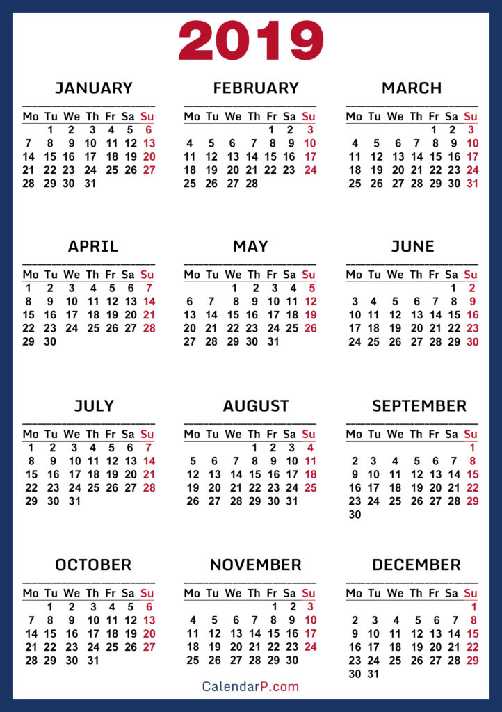 2019 Calendars• Calendars• High Resolution Calendars• High Resolution Calendars Monday Start Printable Free 2019 Calendar, HD, Blue, Red – Monday Start 02/28/201903/01/2019