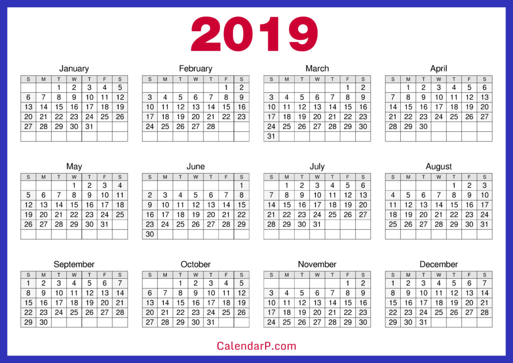 2019 Calendars• Calendars• Horizontal Calendars• Horizontal Calendars Sunday Start 2019 Calendar Printable Free, HD – Electric Blue, Red 03/01/201903/01/2019